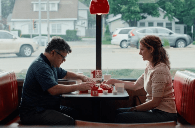 Luego, la película se centra en Jessica (Greer) y su marido, Ron (Sean Astin), quienes acaban de despedirse de su hija en el aeropuerto antes de que ella se dirija a la universidad. No se preocupen por su hija, ya que la película ciertamente no lo hace, reduciéndola a un no personaje cuyo único propósito es hacer que sus padres se cuestionen qué deberían hacer con sus vidas. Ahora que se sienten emocionalmente desatados y con la tensión financiera de cubrir la matrícula sobre ellos, la pareja finalmente decide salir a disfrutar de una comida agradable y relajante en Blake Junior’s. Un pintoresco restaurante de comida rápida que se siente como el lugar de las pesadillas estadounidenses por lo frío y sin vida que es todo, pero también puede ser el lugar favorito de Ron en todo el mundo. Conoce al director principal por su nombre y parece casi tranquilizado por la familiaridad que todo le ofrece. Es un lugar de seguridad y comodidad, donde, aunque nada podría salir mal, nada parece que pueda salir bien. Es un lugar poéticamente apropiado para hacer el origen de un conflicto que consumirá sus vidas.