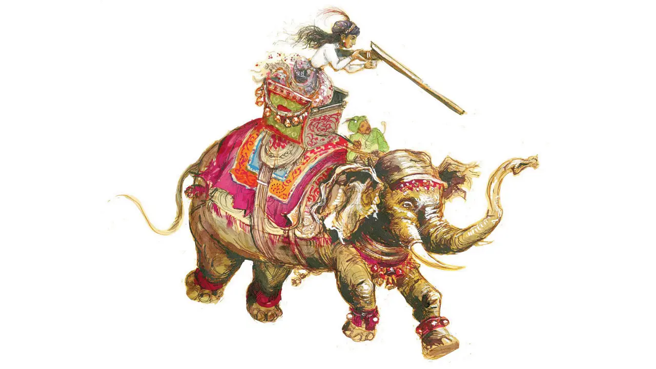 Tiger Slayer se encuentra en serios trabajos de archivo que incluye crónicas de la corte persa, la rica iconografía del arte y la arquitectura, la poesía e historias en la imaginación pública. Molly dibujó mientras escribía las páginas, ambos trabajamos uno al lado del otro, por así decirlo. Además del arte para ser visto simplemente como hermosas inserciones en un libro, nuestro impulso principal era tener palabras e imágenes en la conversación. Guié a Molly continuamente a las fuentes de arte mogol, y ella pasó allí para crear nuevas imágenes suculentas, basadas en tradiciones mogol, pero una gran cantidad de recreación mientras conservaba el estilo mogol. También hizo fotos para esas escenas y figuras que no existen en el archivo pictórico, como Nur disparando al tigre asesino. Como Molly tuvo que prestar atención a las tradiciones de arte mogol, estaba mirando el arte mogol de nuevo a través de preguntas que me estaba haciendo. Muchos de mis episodios fueron guiados por la fuerza de la creación de Molly.
