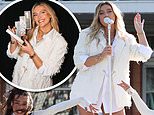 Perrie Edwards puso una exhibición muy pierna con un vestido de envoltura blanca mientras actuaba en la final de cien el domingo y celebró su último sencillo número uno