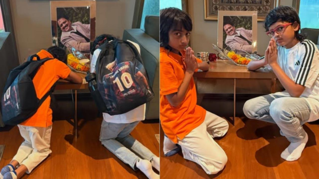 Riteish llevó a Instagram, donde compartió una serie de imágenes. En las dos primeras fotos, se podía ver a los hijos del actor Riaan y Rahyl rezando a las fotografías de su difunto abuelo. El actor también compartió una imagen monocromática de su padre.