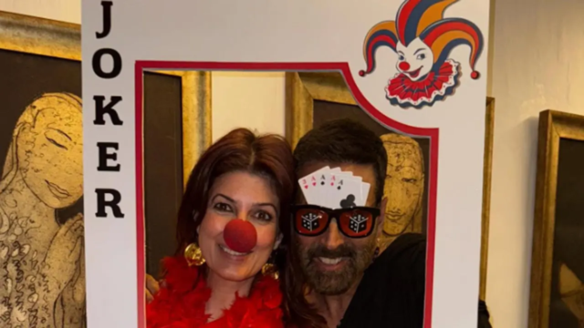 Ella recurrió a su cuenta de Instagram para compartir una imagen divertida de The Bash, donde los dos fueron vistos posando detrás de un gigante recorte de cartas de juego `Joker`. Twinkle lucía un aspecto de payaso con una nariz roja, mientras que Akshay llevaba gafas juguetones decoradas con cartas.