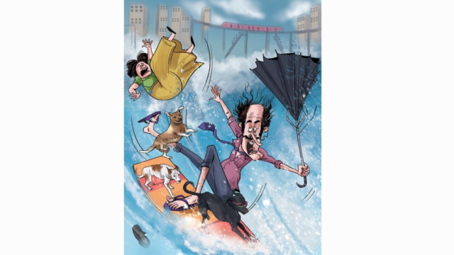 Lobo Lobo, mi técnico de televisión por cable se acercó, empapado hasta el hueso, sus pantalones se enrollaban sobre sus tobillos, su paraguas destruido, todos los radios sobresaliendo, también llevaba una tabla de surf. Parecía un trapo mojado, junto con él había un paquete de callejones empapados, sacudiendo el agua de lluvia.