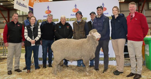 La casa de la casa Barloo Stud, GnowangerUp, superó este año la venta de ovejas Rabobank WA y RAM en Katanning la semana pasada con una encuesta de marzo Shorn Merino Ram que vende por $ 26,000 al Coromandel Stud y Semen comparte a los Estudios Auburn Valley y Rutherglen. Con el Ram estaban Nathan King (izquierda), el gerente de stock de mayores, Ben Hankinson y Georgia Dawes, Rutherglen Stud, Yealering, Jeffrey y Peter Rintoul, Auburn Valley Stud, Williams, Tom y Michael Campbell, Coromandel Stud, Gairdner, Fraser House, Barloo Stud, Rachel Bowman, Rabank Albank y Jeff Sports, Elders Specials. Imagen de Kane Chatfield.