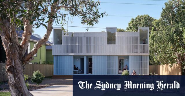 Cada una de las tres casas tiene un jardín central abierto al cielo y es de color azul claro de color, lo que recuerda las chozas de fibro de fibro de Straddie.