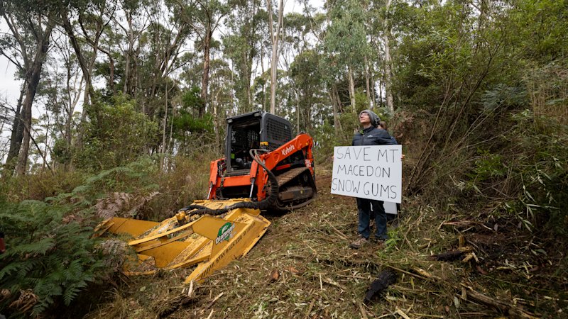 Parks Victoria sigue adelante con sus planes para demoler los árboles de nieve vulnerables esta semana, en un área que también contiene cenizas alpinas en peligro de extinción, para restaurar las vistas de la Cruz Conmemorativa del Monte Macedon.