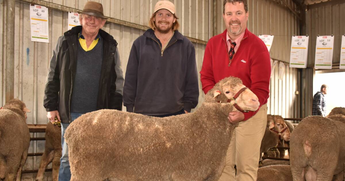 El ex director y propietario del semental de Far Valley Dohne David Kain (izquierda), con un carnero que vendió en la venta de Ram de Far Valley 2023 a la venta de Mollerin Rock Dohne Stud Mitchell Applegate, quien compró el semental Far Valley de Mr Kain en abril. Con la pareja está el gerente de stock de los ancianos WA WA y el clasificador y asesor de Dohne, Nathan King, quien negoció la venta. Imagen de Kyah Peeti.
