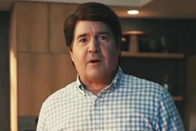 En el video, Fieri aparece bien afeitado y casi agresivamente pulido, vistiendo una camisa a cuadros con botones y pantalones caqui, con su característico cabello rubio puntiagudo reemplazado por un estilo marrón cuidadosamente dividido que no luciría fuera de lugar en una compañía de seguros de nivel medio.
