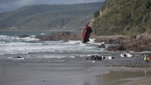 Más de una docena de automóviles fueron rescatados del fuerte oleaje después de que las inundaciones repentinas los arrastraran hacia el mar en los ríos Cumberland y Wye la semana pasada. CRÉDITO: Tim Young/EMV/SES