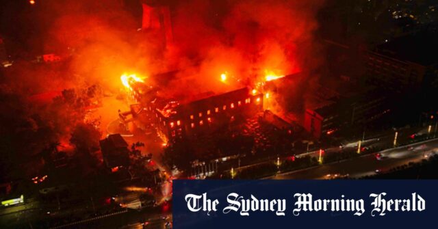 Los manifestantes celebrados como el edificio del Parlamento de Katmandú se encendió el martes. Credit: AP