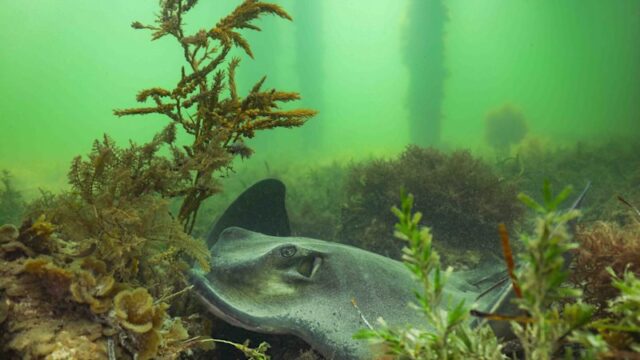 Una raya violinista muerta en la playa del suburbio de Glenelg en Adelaida en julio de 2025 y vinculada a la floración de algas.Getty Images