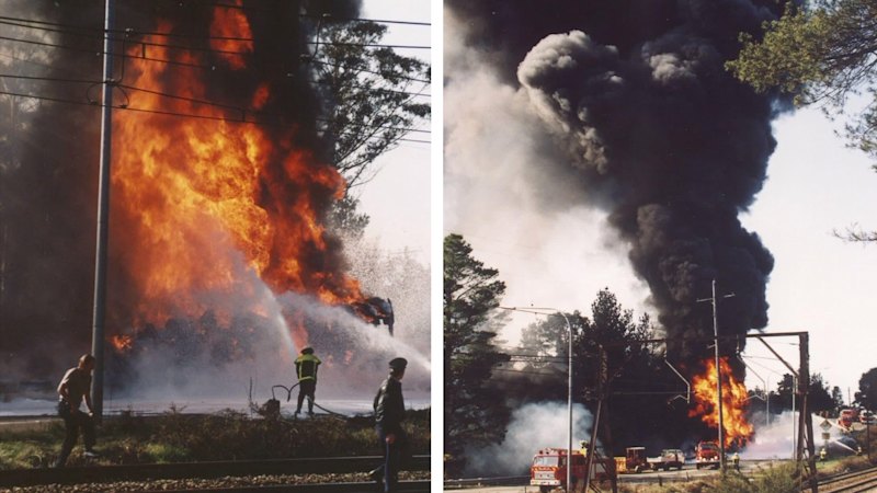 Los bomberos luchan contra el accidente de un camión cisterna de gasolina en Medlow Bath en 1992. Los resultados de las pruebas sugieren que el incendio puede ser la causa de la contaminación por PFAS.Facebook