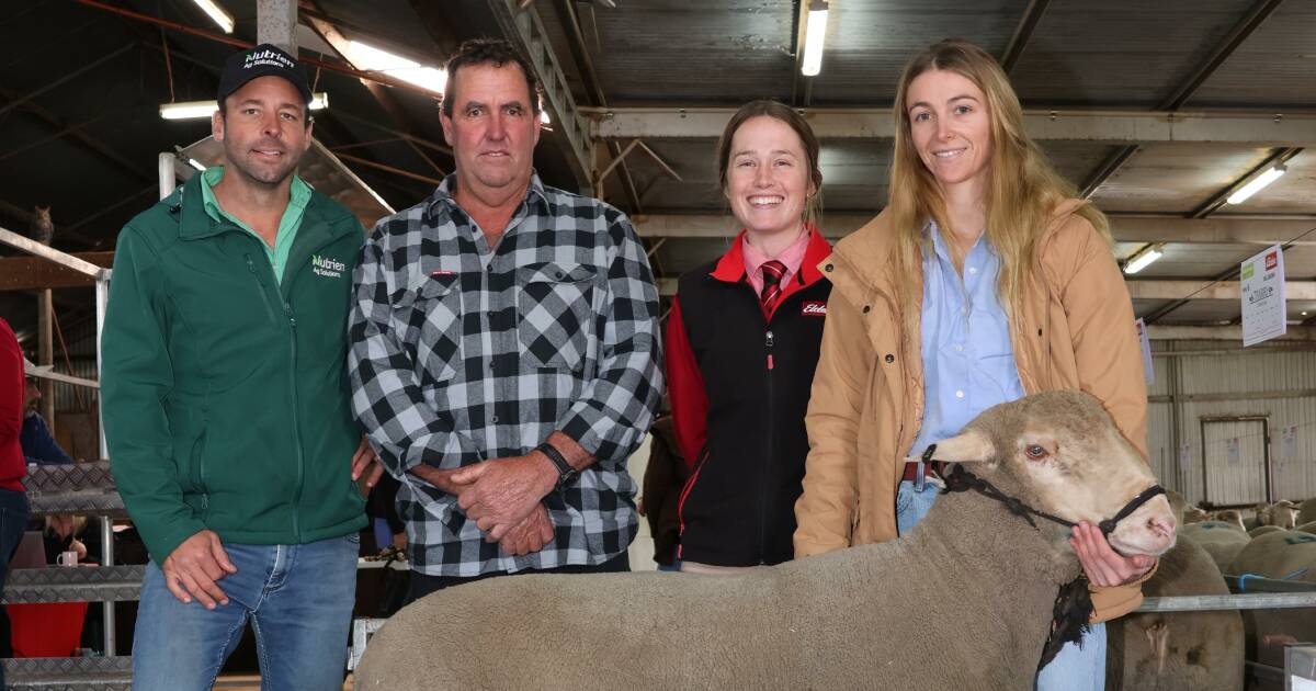 Kelly-Anne (izquierda) y Mia Gooch, Tiarri/Uralla Prime Samm Stud, Lake Grace, el comprador de volumen Dwight Ness, Ness Prazing, Newdegate, y su agente de acciones Graeme Taylor, Elders, el lago Grace/Dumbleyung, con uno de los ramas de Ness, 12 Rams comprados en la venta de Rams de $ 1600 fueron donados por los Tiari/Uralla. Fundación anti-bullying y servicio de apoyo juvenil Dollys Dream. Imagen de Kane Chatfield.