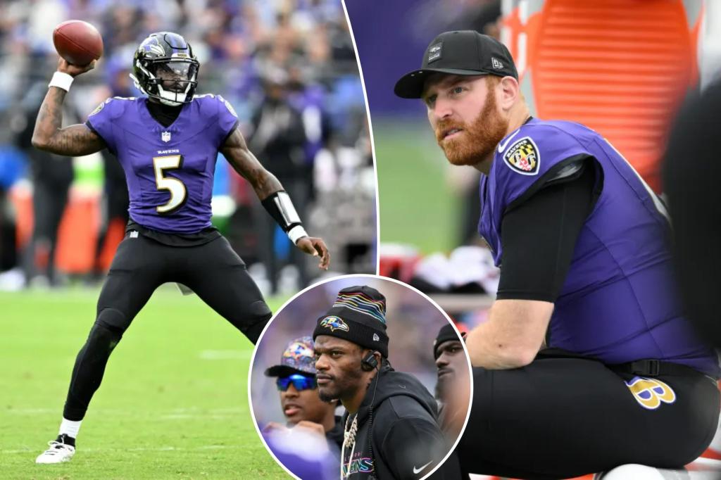 Tyler Huntley intenta un tiro después de reemplazar a Cooper Rush durante la derrota de los Ravens ante los Rams el 12 de octubre. Getty Images Lamar Jackson aparece en la banca durante la derrota de los Ravens ante los Rams el 12 de octubre. AP