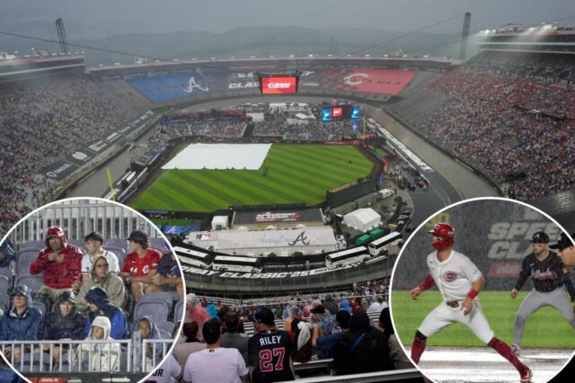 El clásico de Speedway entre los Bravos de Atlanta y los Reds de Cincinnati se suspendió en la primera entrada debido a la lluvia, empapando una multitud récord para el primer juego de temporada regular en Tennessee. El plan es reanudar el juego el domingo por la tarde.