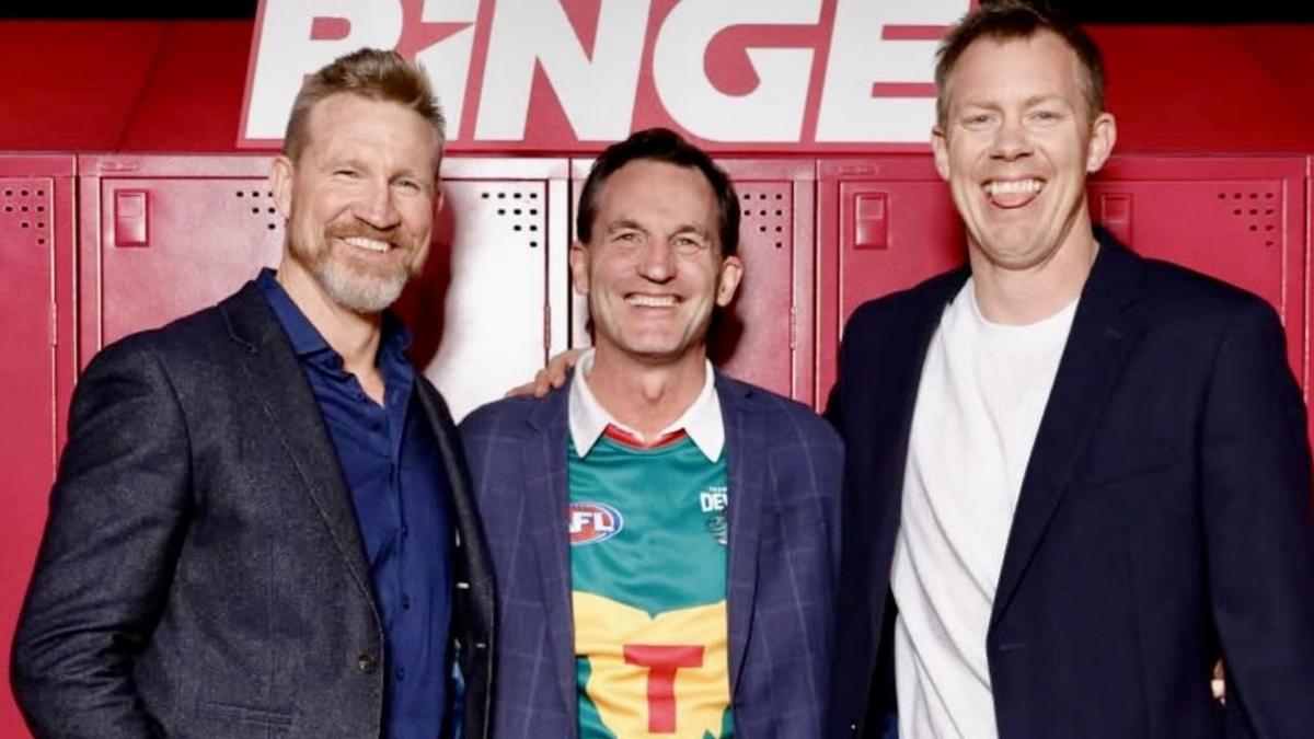 Cámara Iconnathan Buckley, Andrew Dillon y Jack Riewoldt en una función en Tasmania. Crédito suministrado: suministrado