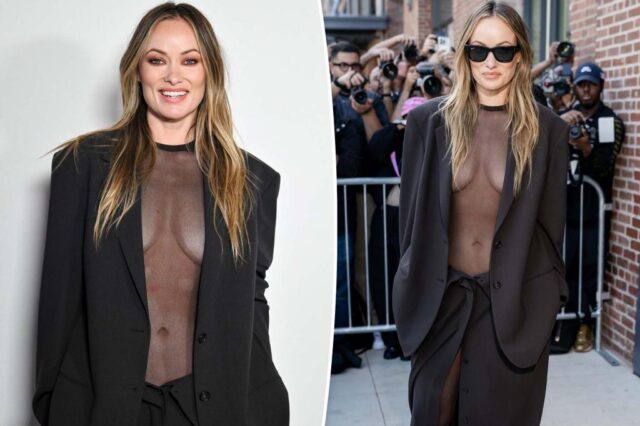 Olivia Wilde llamó la atención cuando llegó a una blusa completamente transparente en la presentación de Michael Kors en la primavera 2026 en Nueva York. AFP a través de Getty Images combinó el traje de manga larga y transparente con un blazer de gran tamaño y una falda de baja altura a juego. Imágenes GC