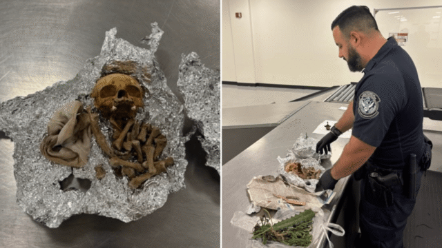 Entre los artículos no declarados se encontraban “plantas prohibidas, cigarros no declarados y una bolsa de lona envuelta en lámina que contenía lo que parecía restos humanos, incluida parte de un cráneo”.