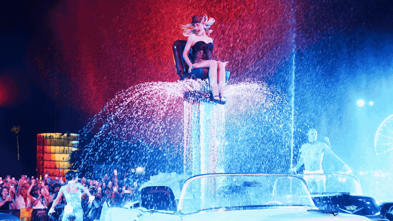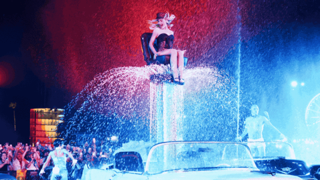 La cantante de Manchild transformó el escenario del desierto en una fantasía maximalista (apodada “Sabrinawood”) para una actuación de 90 minutos llena de teatralidad, vestuario de inspiración burlesca (diseñado por Jonathan Anderson de Dior) y las insinuaciones características de la joven de 26 años.