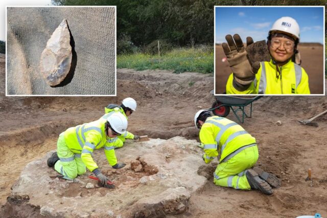 Las imágenes de la excavación muestran a los arqueólogos sosteniendo algunos de los artefactos antiguos que fueron descubiertos, incluidas herramientas de pedernal y fragmentos de cerámica. Museo de Arqueología de Londres / Facebook “Estos no eran sólo espacios habitables… (Ellos) también actuaban como centros sociales, con un hogar central para cocinar y mantenerse caliente”, decía el comunicado de prensa. Museo de Arqueología de Londres / Facebook