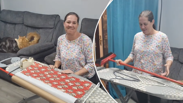 La usuaria de TikTok Claire Lee creó la mejor estación para envolver regalos con una escoba, dos perchas y una tabla de planchar.