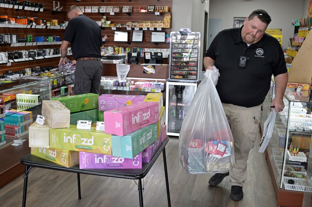 De vuelta en Vapor Maven, Vaughn y el investigador de licencias líderes Charles Keyes inventoró y eliminó los productos ofensivos de los estantes durante su visita.