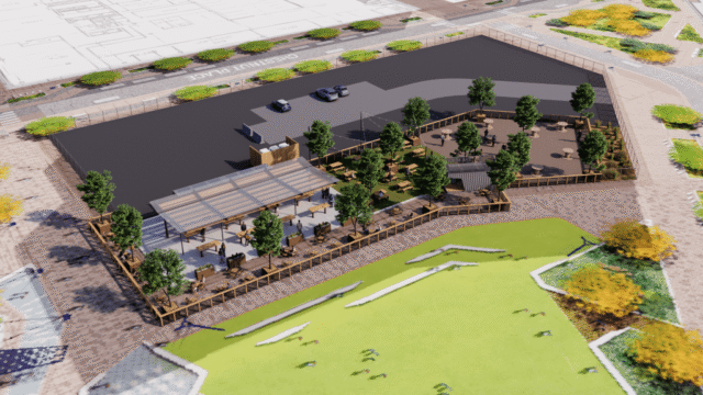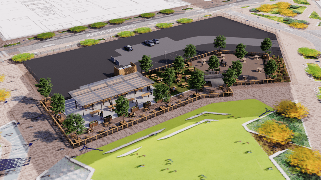 La taberna al aire libre incluirá una carpa con calefacción para las estaciones más frías, un espacio flexible para eventos y un césped diseñado para juegos y deportes como voleibol, fútbol y bádminton.