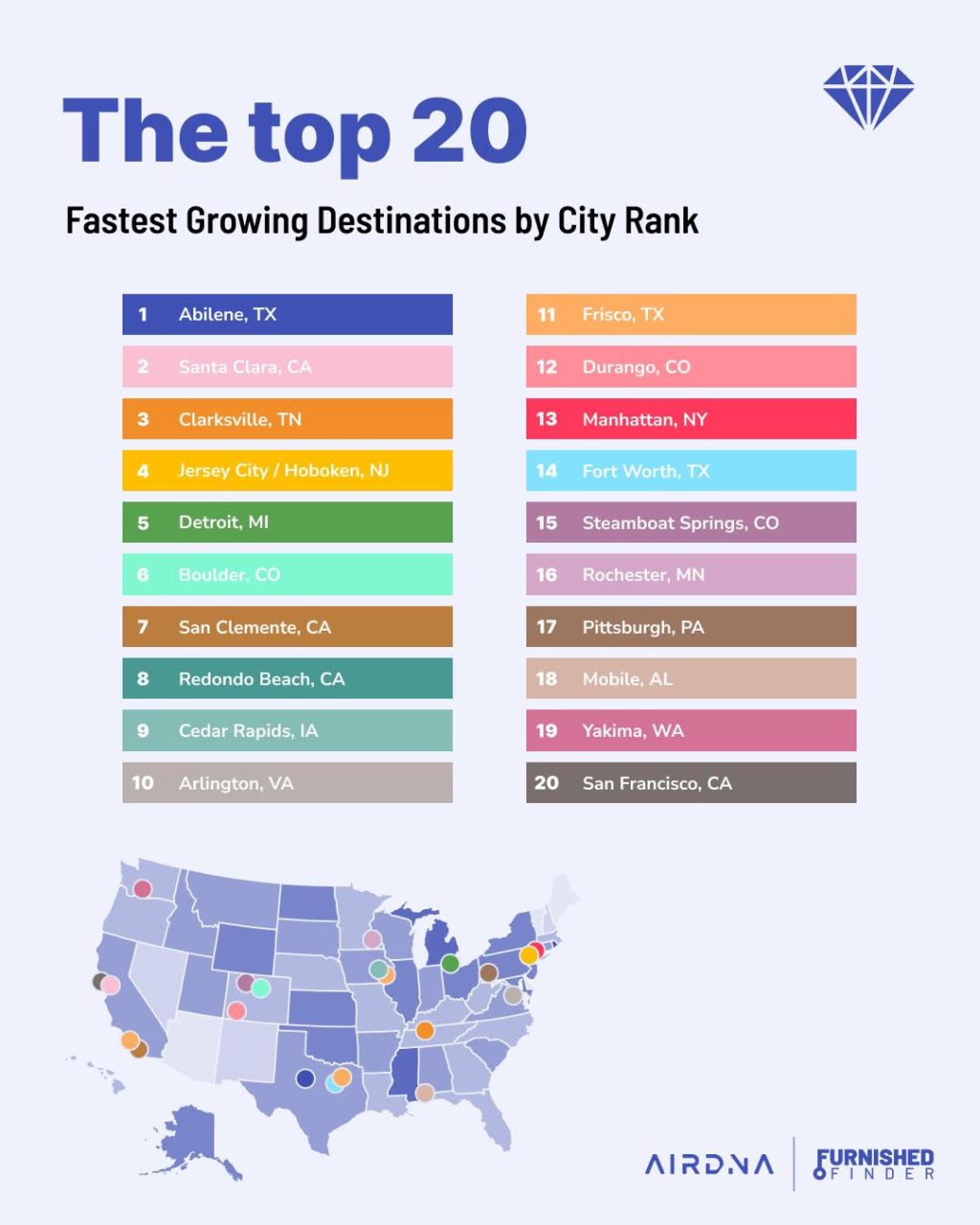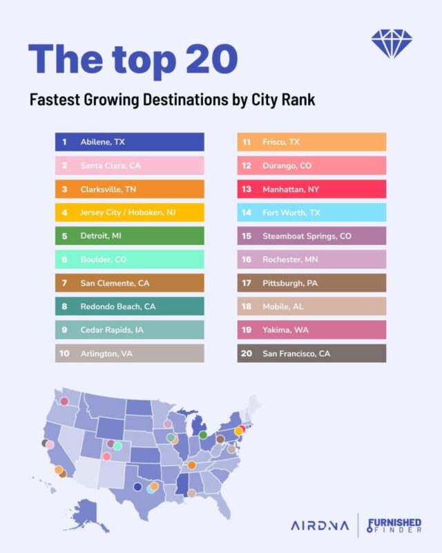 Aunque Denver no estaba entre los 20 primeros, lidera el estado con más de 2,800 propiedades de alquiler mensual. En los últimos 12 meses, estas propiedades albergaron a más de 59.000 inquilinos únicos. De ellos, el 31% eran profesionales de la salud, el 25% eran familias que se trasladaban y el 24% eran viajeros de negocios.