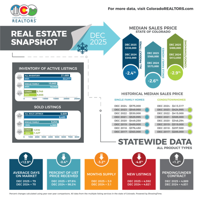 Diciembre se desarrolló como se esperaba: los nuevos listados se desaceleraron, las ventas pendientes cayeron y el mercado entró en su hibernación estacional, según el informe mensual de la Asociación de Agentes Inmobiliarios de Colorado.