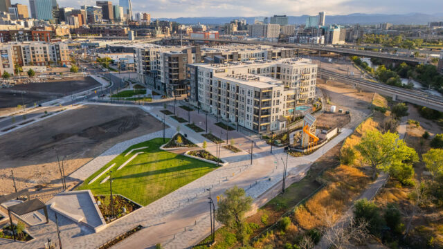 Más de 4 acres de nuevos parques frente al río, plazas y espacios verdes se abrirán esta semana en Mercado en el Distrito de Arte Rino de Denver.