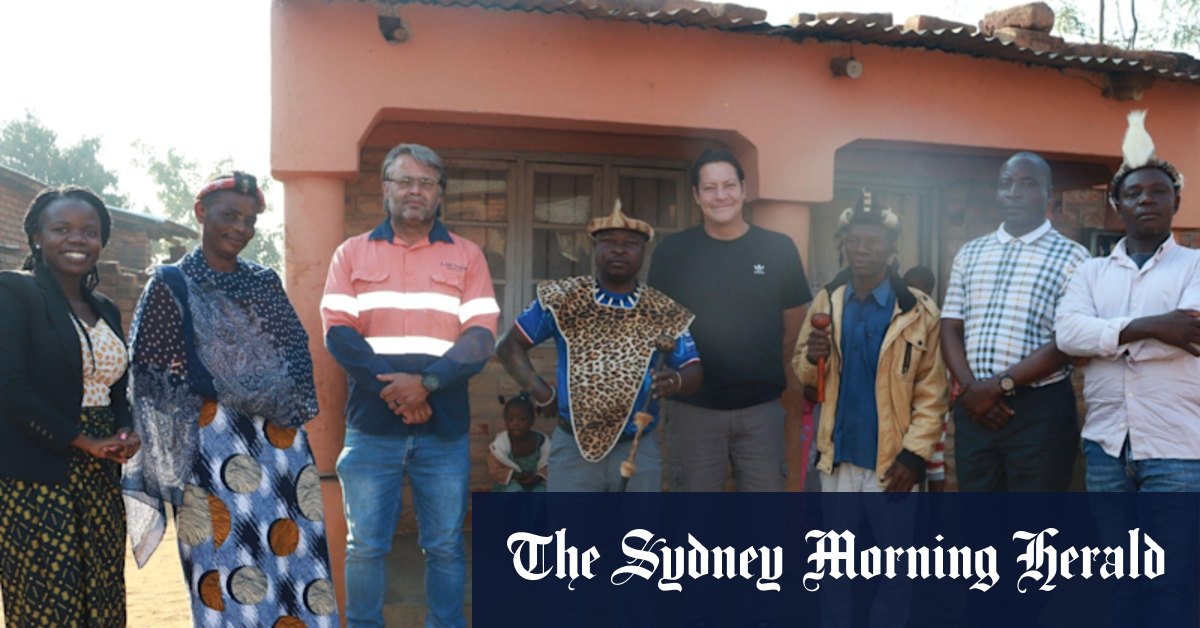 El gerente de construcción de Lindian Resources, Daniel Britz, y la Oficial de Enlace Comunitario Rebecca Hami se encuentran con el jefe de área y los líderes comunitarios. Lindian dice que la participación comunitaria ha disminuido en el riesgo de sus primeros trabajos del sitio.
