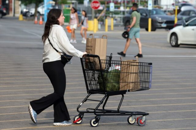 Gloryana Angus, a la derecha, carga comestibles, incluida la leche, en su automóvil con su esposo, Bill Angus, después de comprar en Aldi el 2 de mayo de 2025 en Morton Grove. (Audrey Richardson/Chicago Tribune)