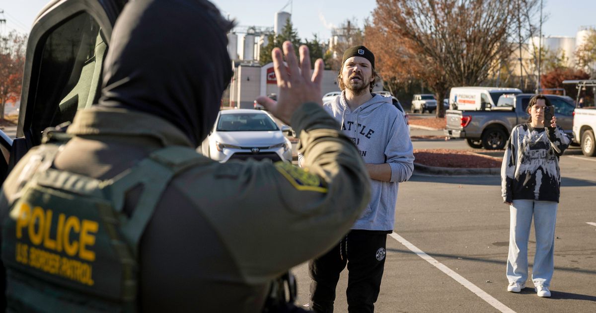 Un activista le grita a un agente de la Patrulla Fronteriza de EE. UU. afuera de una tienda Home Depot el 19 de noviembre de 2025 en Charlotte, Carolina del Norte (Imagen: Getty Images)