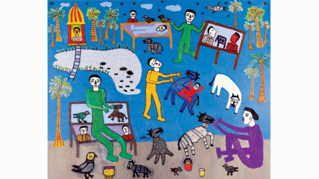 Dos de las pinturas en la exposición, ‘estanque en mi pueblo’ y ‘bañarse en el estanque’ presentan escenas vibrantes de la aldea alrededor de los cuerpos de agua, con hombres y mujeres, pájaros y animales, árboles, charpais, chozas y santuarios, acariciando esas femorias y deseos asociados con su idílica infantil en Sanjara, Gujarat, que el artista de 83 años de 83 años aludió durante la sesión del evento. ‘Circus de viaje en mi pueblo’, un gran tríptico que ocupa un extremo de la exhibición, con sus representaciones infinitamente inventivas de Behrupiyas, acróbatas ágiles con cuernos de diablo y una variedad de criaturas híbridas y fantásticas, de manera similar, se inspira en las vistas y experiencias de la infancia rural del artista. A pesar de haber pasado una gran parte de su vida adulta en los centros urbanos, Parekh es, como insiste, “no un pintor de ciudades”.
