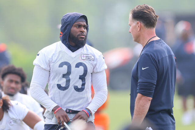 Jaylon Johnson #33 de los Chicago Bears habla con el entrenador en jefe Matt Eberflus durante el minicampamento en Halas Hall el 15 de junio de 2023 en Lake Forest, Illinois. Jaylon Johnson #33 de los Chicago Bears habla con el entrenador en jefe Matt Eberflus durante el minicampamento en Halas Hall el 15 de junio de 2023 en Lake Forest, Illinois. Michael Reaves/Getty Images