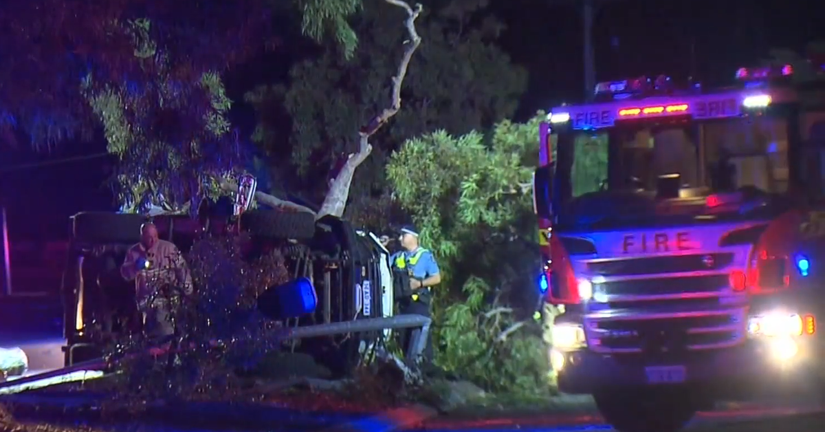 El Toyota Land Cruiser quedó un desastre retorcido y se volteó de lado, después de que el conductor supuestamente perdió el control a lo largo de Southern River Road en Gosnells justo después de la medianoche.