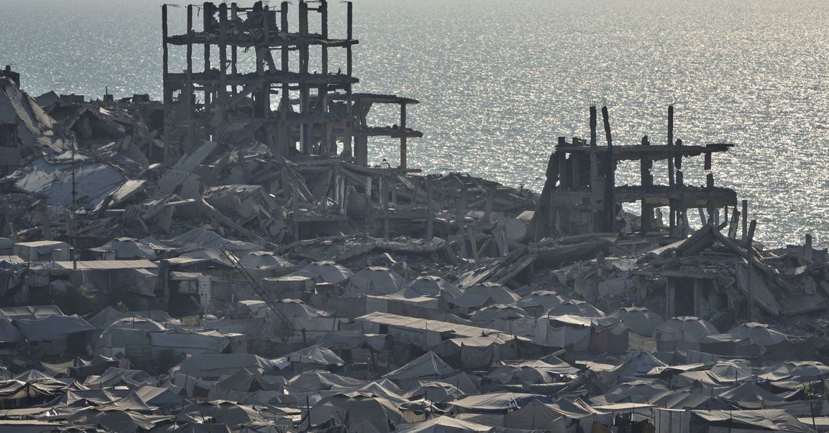 Los palestinos se encuentran junto a un campamento improvisado de carpa ubicado junto a los edificios destruidos durante las operaciones aéreas y terrestres israelíes, en la ciudad de Gaza, sábado 23 de agosto de 2025. (Photo/Jehad Alshrafi)