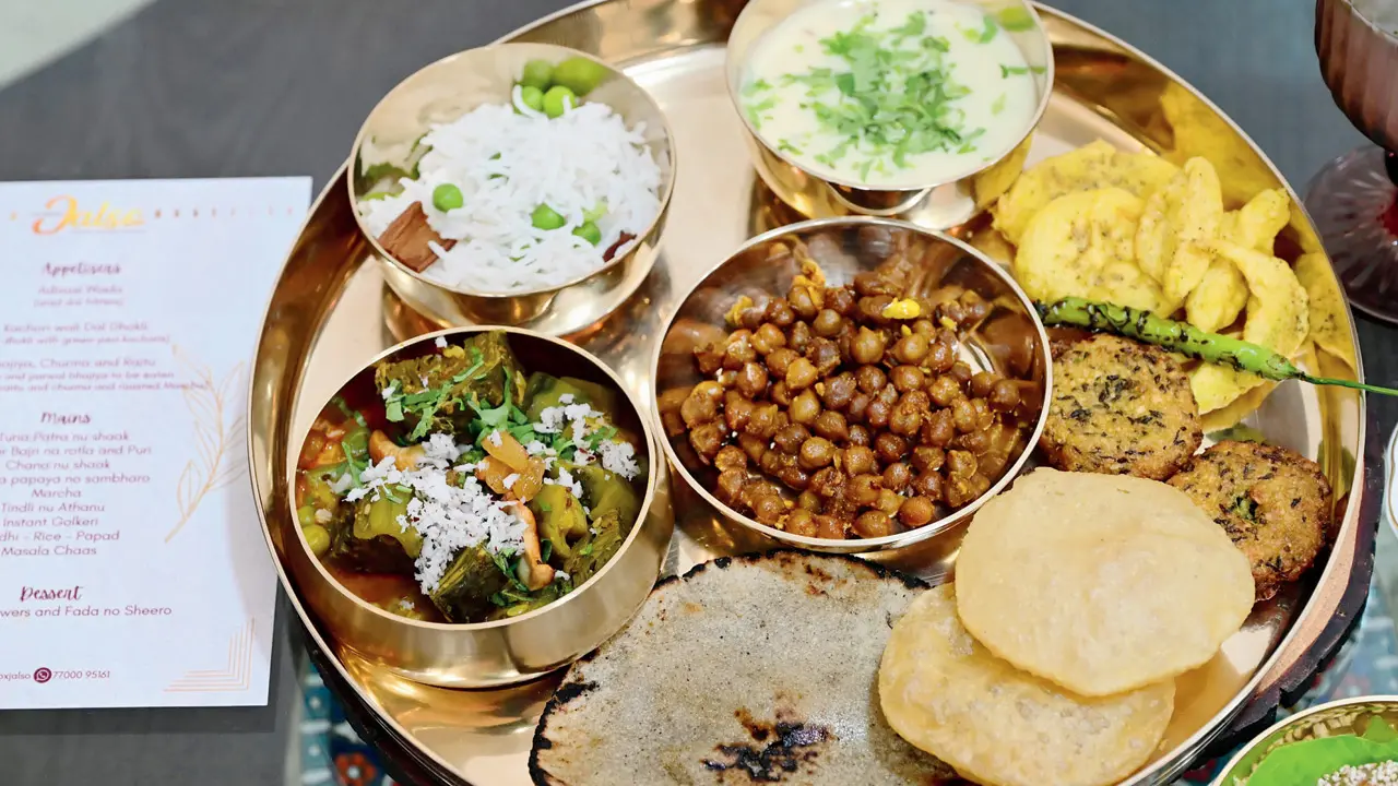 Los huéspedes están sentados sobre cojines en el suelo alrededor de una mesa baja de estilo tradicional. Dhruti, que dirige la cocina, comienza la comida con una bandeja de condimentos: pepinillos picantes, kacchi kairi y amba halad. El plato farsan trae masaledar batata vada, dhokla blanco suave y khichu caliente. Luego llega una variedad de undhiyu servido con bajra rotlo, puri y roti, combinado con sev tameta nu shaak, mix kathol y Surti dal de Bhagat. El puran poli, rociado generosamente con ghee, completa la comida, seguido de cucharadas de sitafal basundi y papad crujiente para limpiar el paladar.
