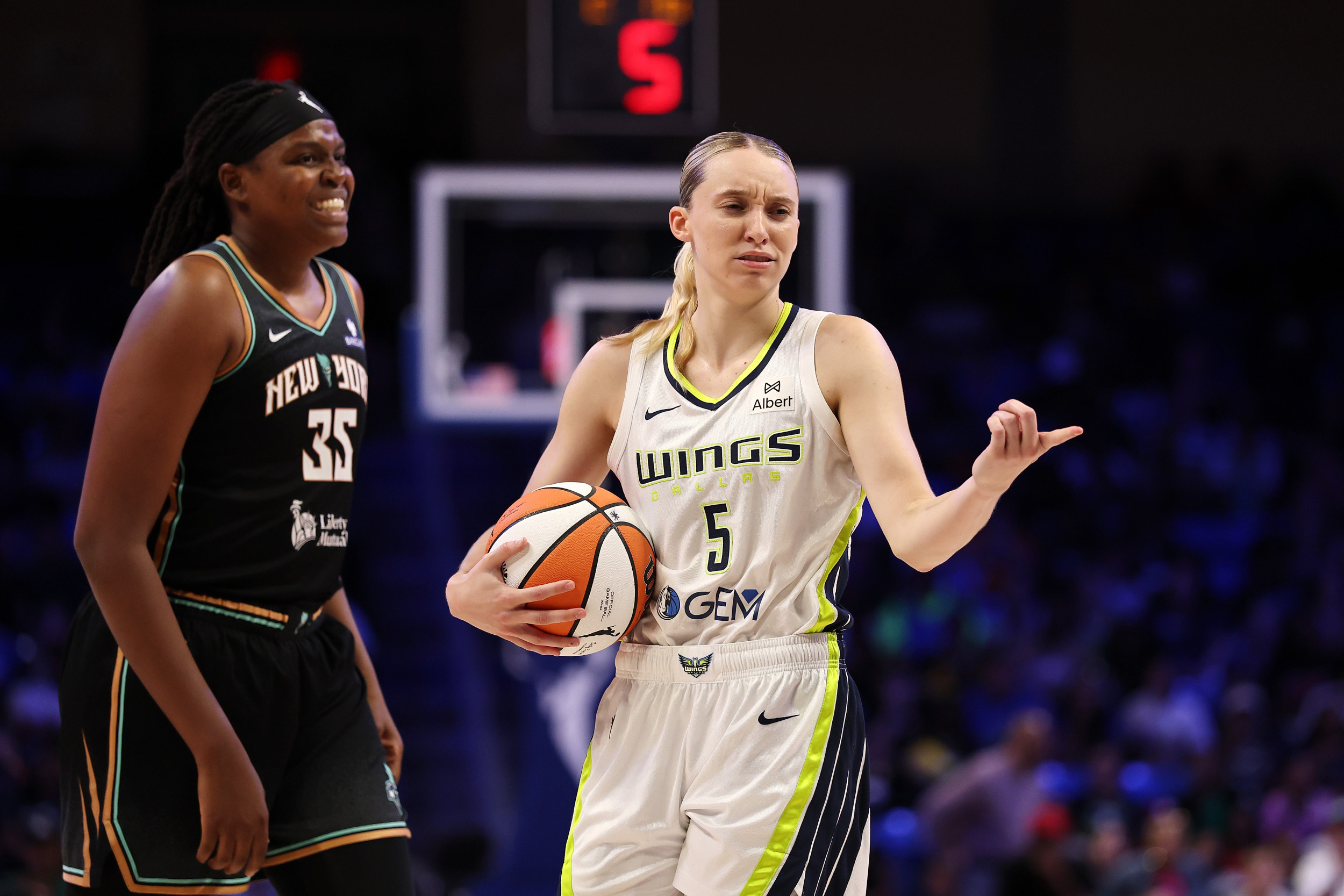 Paige Bueckers #5 de los Dallas Wings reacciona a una falta durante la segunda mitad de un juego contra el New York Liberty en el College Park Center el 28 de julio de 2025 en Arlington, Texas. Paige Bueckers #5 de los Dallas Wings reacciona a una falta durante la segunda mitad de un juego contra el New York Liberty en el College Park Center el 28 de julio de 2025 en Arlington, Texas. Stacy Revere/Getty Images