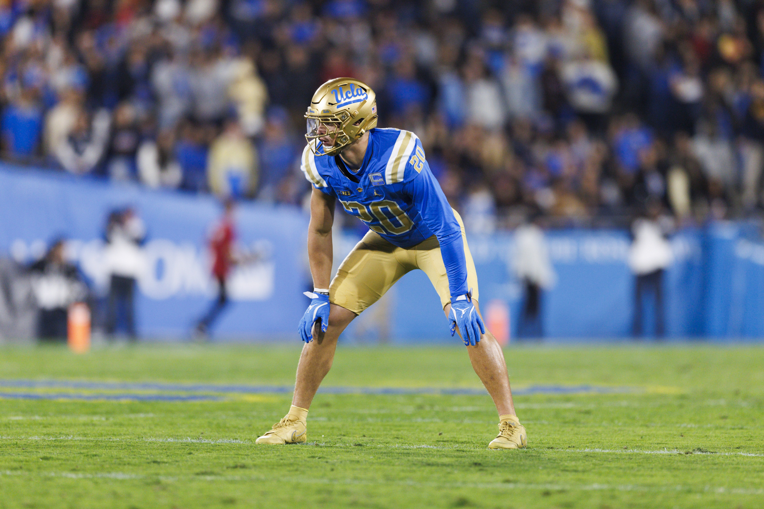 Kain Medrano #20 de los UCLA Bruins se defiende durante la primera mitad contra los troyanos de la USC en Rose Bowl el 23 de noviembre de 2024 en Pasadena, California. Kain Medrano #20 de los UCLA Bruins se defiende durante la primera mitad contra los troyanos de la USC en Rose Bowl el 23 de noviembre de 2024 en Pasadena, California. Ric Tapia/Getty Images