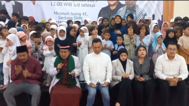 Yakarta, presidente de Viva-Candidate de la Asociación de Antiguos Alumnos de la Universidad de Indonesia (ILUNI UI) 2025-2028, Boni Hargens reunió a los huérfanos y realizó una oración conjunta en el Edificio Juang, Menteng, Central Jakarta el jueves 21 de agosto de 2025.
