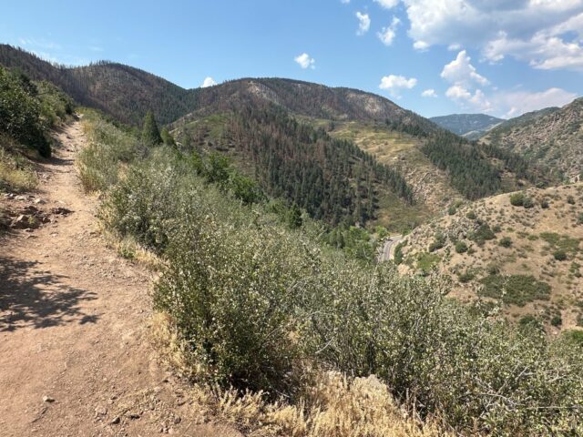 El sendero Meadowlark de 1.5 millas, que sube 400 pies, no se extiende al área de los árboles quemados arriba, pero cruza las áreas empinadas que se quemaron. Estaban negros hasta abril, cuando Jeffco Open Space lanzó los esfuerzos de regeneración desde el aire. Ahora están regresando, exuberantes y verdes en puntos, con un nuevo crecimiento. El sendero se atraviesa esas áreas a través de las curvas.