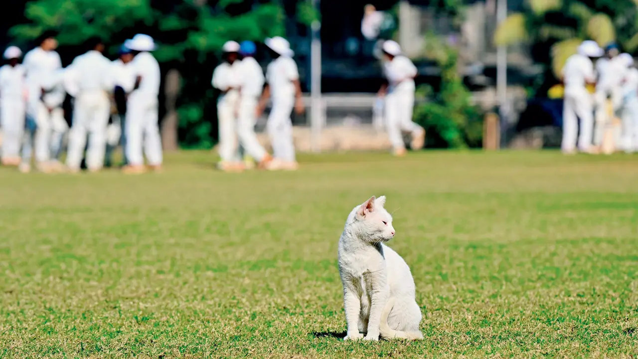 Un gato toma el sol en el campo de cricket durante la semifinal interescolar Harris Shield de MSSA en el MIG Cricket Club, Bandra East