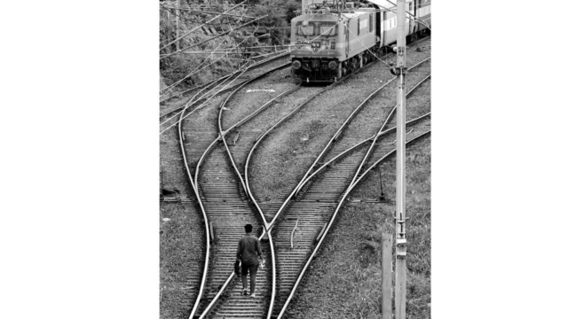 Un abanderado ferroviario en una vía de servicio cerca de la estación Ram Mandir