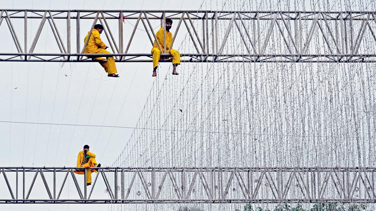 Los trabajadores en impermeables amarillos brillantes establecen luces de celebración en un pandal en Bandra West por delante de Ganeshotsav.