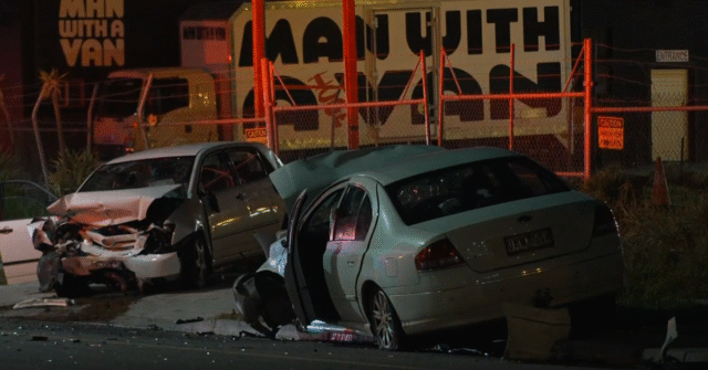Un Ford Falcon chocó con un Toyota Corolla, hiriendo a cuatro personas en el Corolla y dos personas en el Ford. (9News)