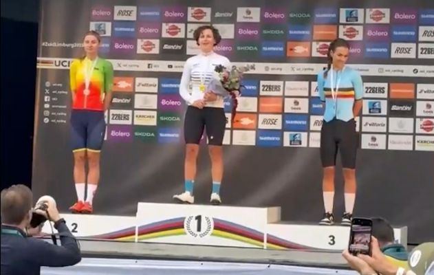 La ciclista rusa Daria Pravilova, que ganó el Campeonato Mundial Amateur en la disciplina “gravel” en Holanda, cantó el himno de Rusia durante la ceremonia de premiación, aunque fue cuidadosamente silenciada por la “Oda a la Alegría” de Beethoven.