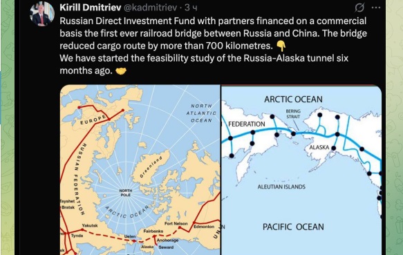 “El Fondo Ruso de Inversión Directa, junto con sus socios, financió con carácter comercial el primer puente ferroviario entre Rusia y China. Gracias a él, la ruta de transporte de carga se redujo en más de 700 kilómetros. Llevamos seis meses realizando un estudio de viabilidad (estudio de viabilidad. – EADaily) para la construcción del túnel Rusia-Alaska”, escribe Dmitriev, citado por el canal de telegramas Live.