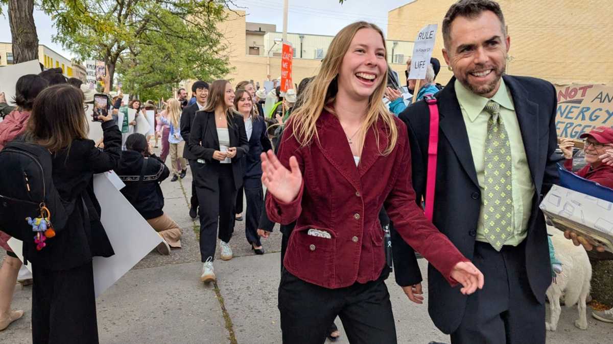 Eva Lightthiser (2R), demandante principal en el Lightthiser v. Trump Case, camina con el abogado Mat dos Santos cuando llegan al Palacio de Justicia de Russell Smith en Missoula, Montana, el 16 de septiembre de 2025. Foto: Issam Ahmed / AFP