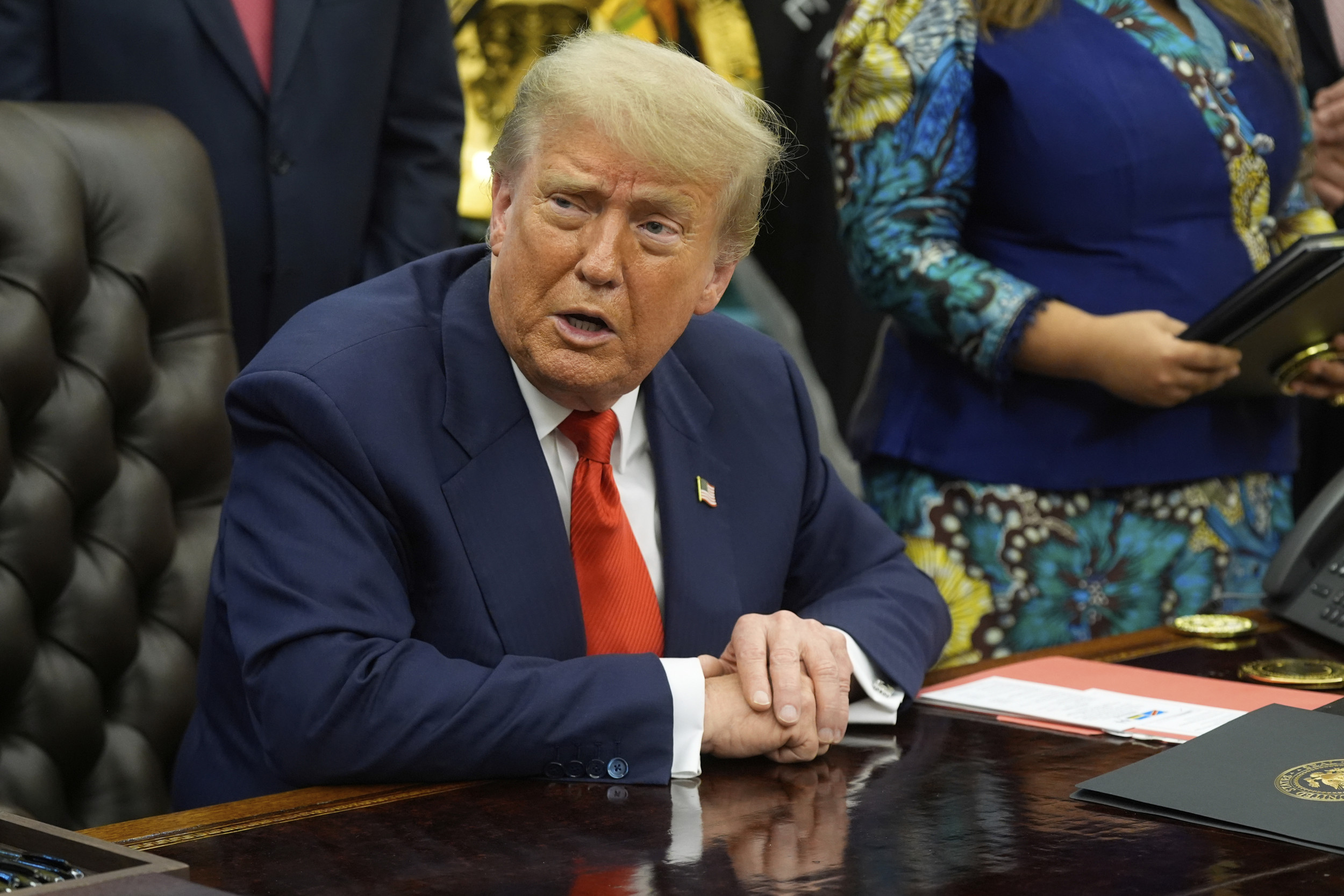 El presidente Donald Trump responde preguntas de los periodistas mientras se reúne con el ministro de Relaciones Exteriores de los Congoleses, Therese Kayikwamba Wagner y el ministro de Relaciones Exteriores de Ruanda, Olivier Nduhungirehe, el 27 de junio de 2025, en la Oficina Oval de la Casa Blanca, Donald Trump, responde preguntas de los reportadores mientras se reúne con el ministro de Asuntos Exteriores de Congoleseses Kayikwamba Wagner y Ruidan Rwandan Nwandan NiVIL El 27 de junio de 2025, en la Oficina Oval de la Casa Blanca en Washington. Más Photo AP/Manuel Balce Ceneta