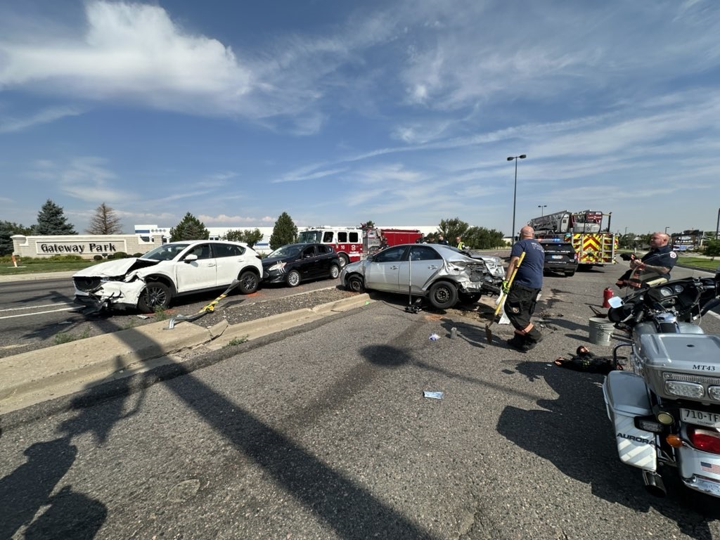 Luego robó un KIA y dirigió a la policía en otra persecución, que terminó con un accidente cerca de E. 40th Avenue y Tower Road alrededor de las 10 a.m., dijo Easterwood. El accidente involucró múltiples vehículos y cerró brevemente los carriles hacia el norte de Tower Road, pero el sospechoso fue la única persona herida en esos accidentes. Permaneció hospitalizado a partir de las 2 pm del viernes, aunque la policía no había recibido una actualización sobre su condición, dijo.